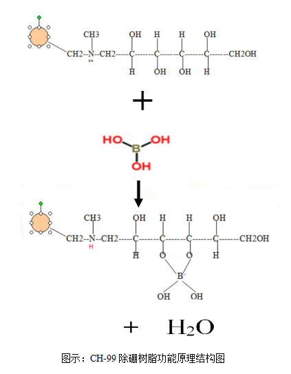 其原理是CH-99離子交換樹脂這種化學結構在官能團中具有多羥基部分與硼之間生成絡合陰離子,其胺基部分作為陰離子交換基捕捉生成的絡合陰離子,從而選擇吸附硼離子。CH-99樹脂不受大量共存鹽類的影響,其反應對pH值很敏感,絡合離子只有在中性或堿性溶液里才能生成,在酸性溶液里絡合離子分解。