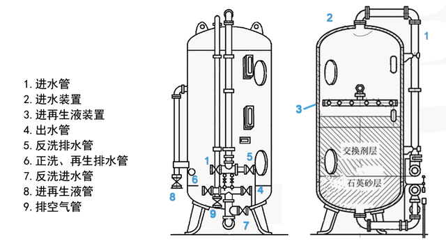 離子交換設備的構成,包括桶體、進水裝置、排水裝置,再生液分布裝置及體外有關管道和閥門。