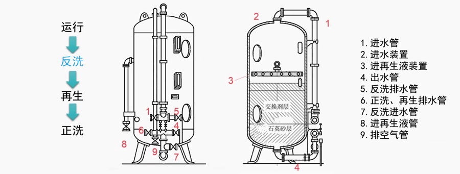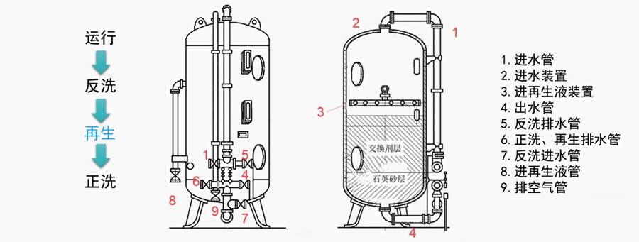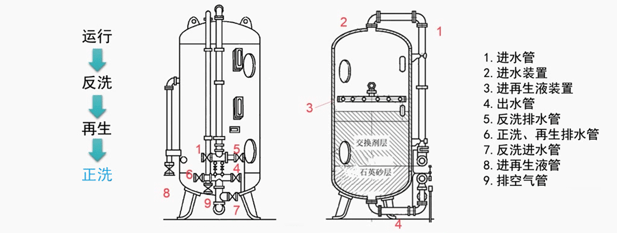 最后再用干凈的軟化水進行正洗,軟化水經過進水管、進水裝置,經過樹脂層、石英砂墊層后,從底部排出。