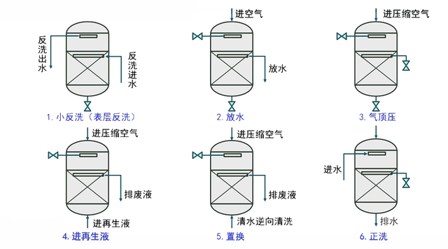 與順流式相比,逆流式離子交換器的再生方式要略微復雜一些,以逆流式交換器頂壓法再生過程為例: