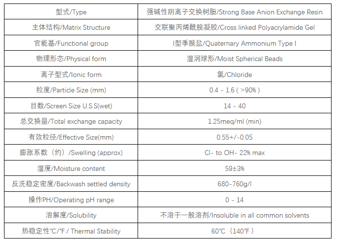 Tulsimer?A-853E是一款包含季胺I型官能團的聚苯乙烯架構的“堅韌膠凝體”強堿型陰離子交換樹脂。
